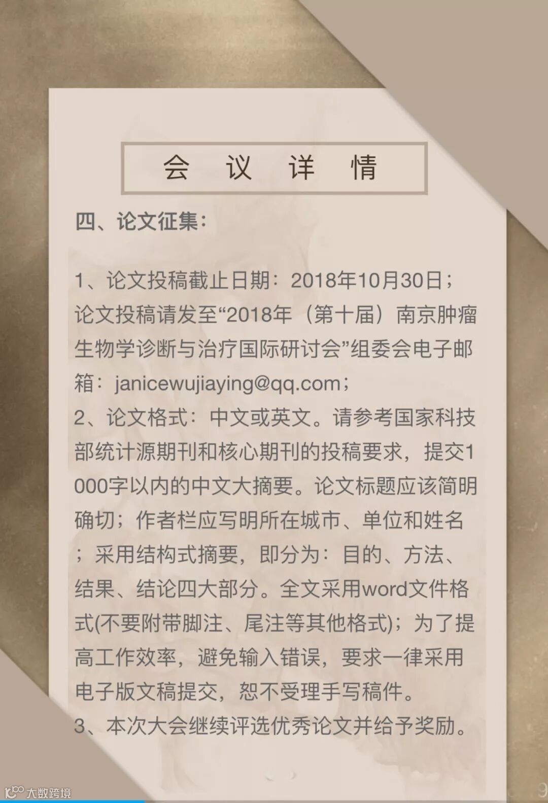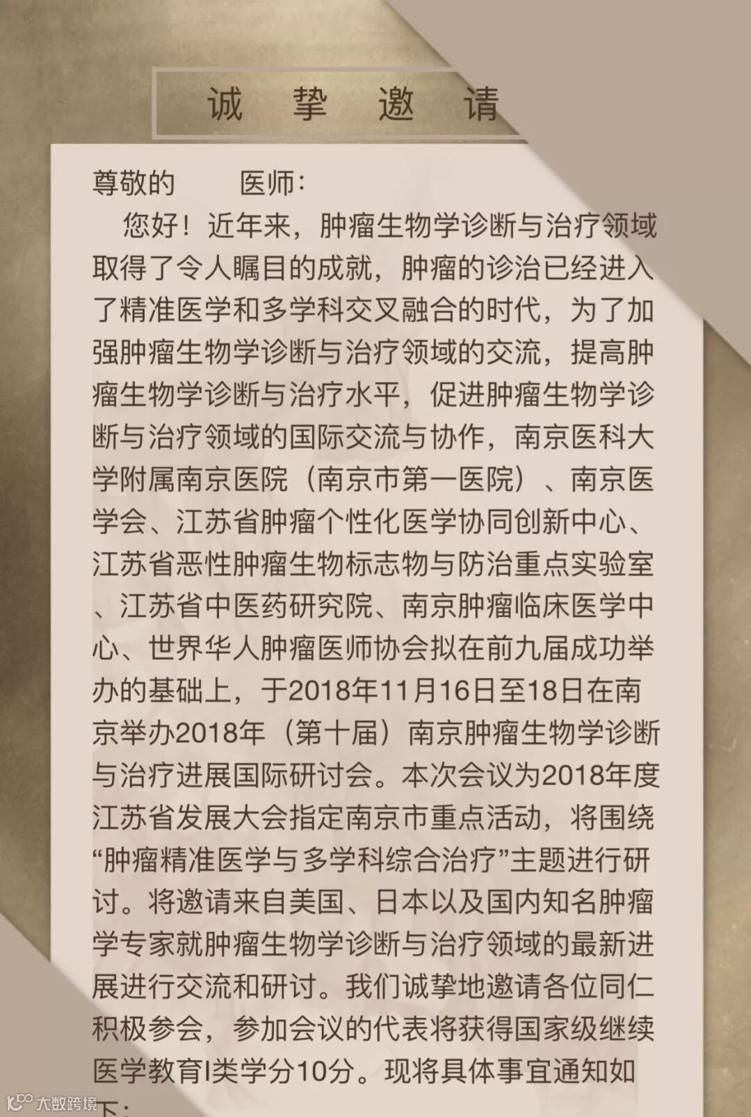 导读:2018年江苏省发展大会指定南京市重点活动2018年(第十届)南京肿瘤生物学诊断与治疗进展国际研讨会邀请函