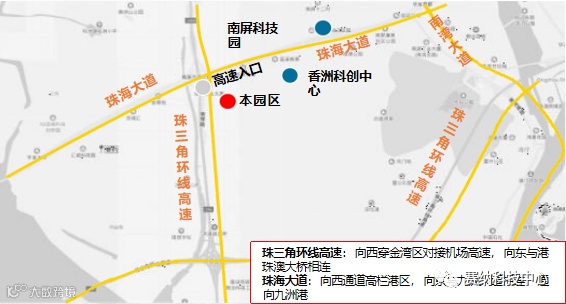 赛纳科技中心外部连接珠海大道、珠三角环线高速等主干道,毗邻珠三角环线高速入口,可达港珠澳大桥、九洲港、金湾机场等主要交通枢纽,是东西部接壤的便利节点。交通通达性良好,与主要交通节点快速直接相连的优越地理位置形成了半小时内可达珠海站、拱北口岸、横琴自贸区、澳门、中山等地的便利交通圈。