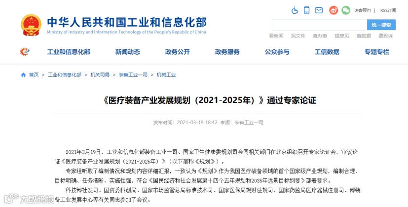 《规划》中提到:“‘十三五’期间,我国医疗装备产业高速发展,市场规模年均复合增长率为13.6%, 2019年市场规模达8000亿元,国内企业产值国际占比超过 10%,成为全球重要的医疗装备生产基地。”