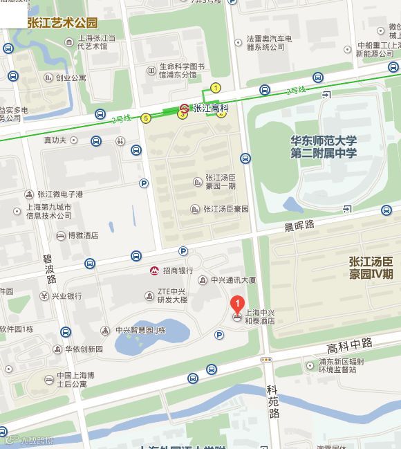 中兴和泰酒店 上海市浦东张江高科科苑路866号 地铁2号线张江高科站2号口出,步行700m。沿科苑路南行即可