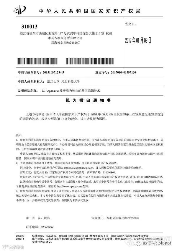 [导读] 据国家知识产权局消息,以河北科技大学副教授韩春雨、浙江大学基础医学院研究员沈啸为发明人的专利——以Argonaute核酸酶为核心的基因编辑技术,因申请人未在规定期限内答复国家知识产权的第一次审查意见通知书,该专利的申请被视为撤回。