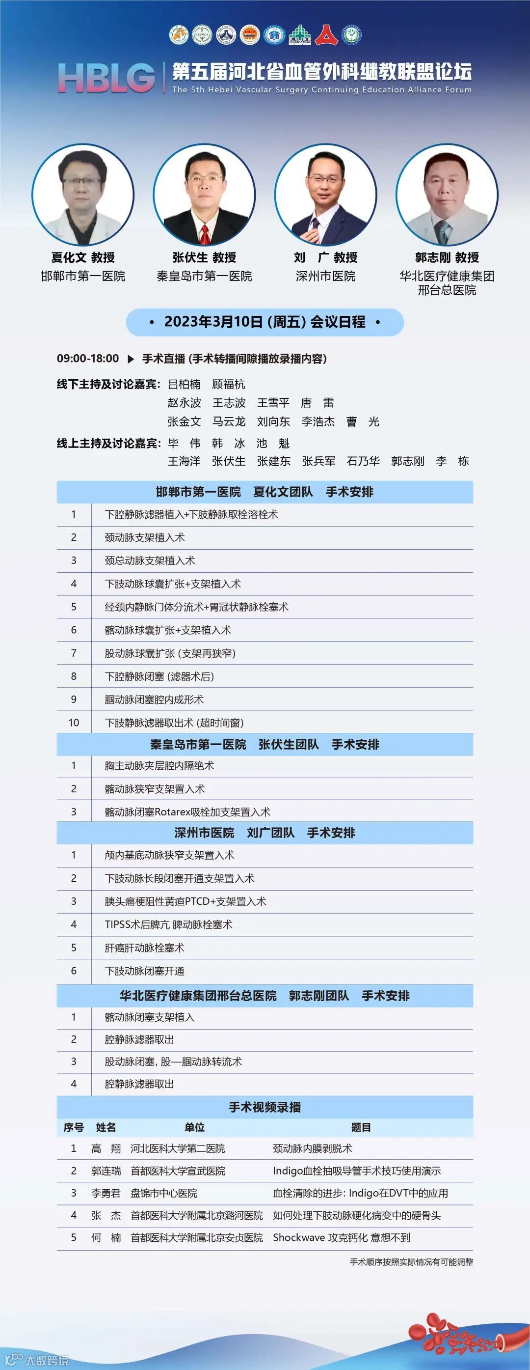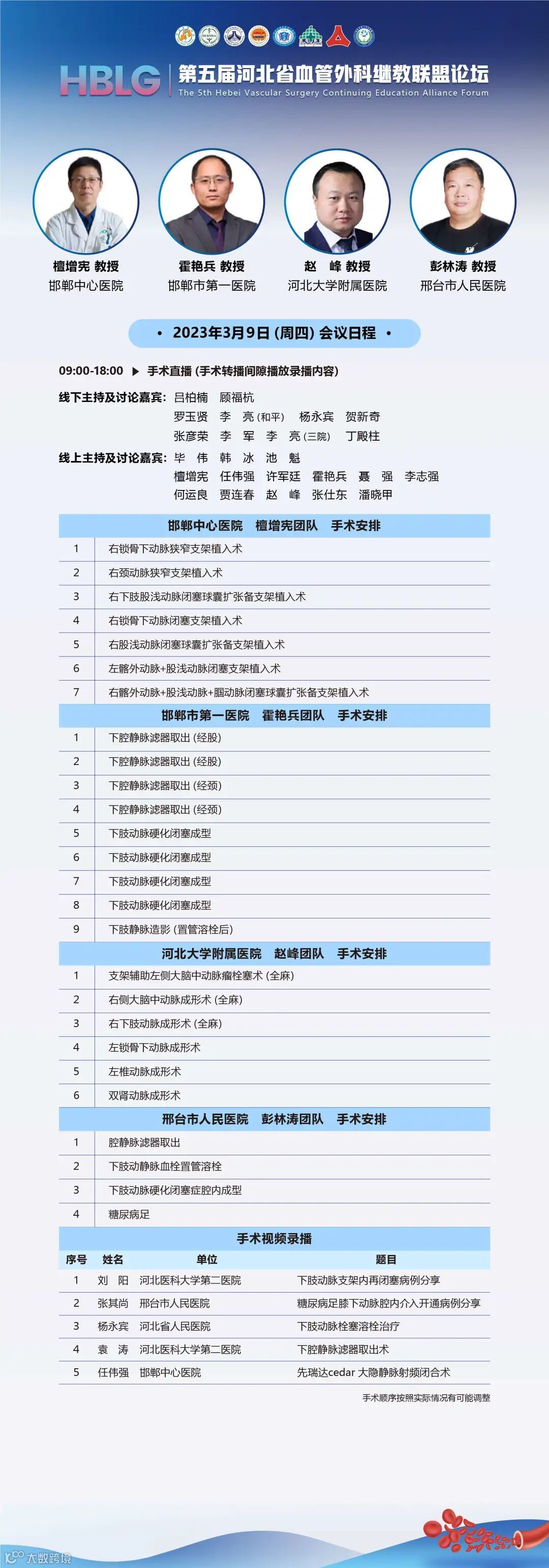 第五届河北省血管外科继教联盟论坛(HBLG),历时6天,19家手术中心精彩展现94例手术直播,线下11台经典手术复盘。现在,让我们回顾一下这6天会议活动日程内容,一起见证这场血管外科的学术盛会。