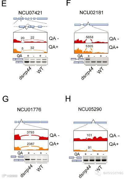 (E-H)RT-PCR结果展示在QA存在和不存在时dsrrp44损伤生长的四种基因的差异性剪接。野生型作为对照。上图:有或没有QA时dsrrp44的四中可变剪接的Sashimi plots。高度代表总的阅读范围。下图:三个独立RT-PCR的典型结果。