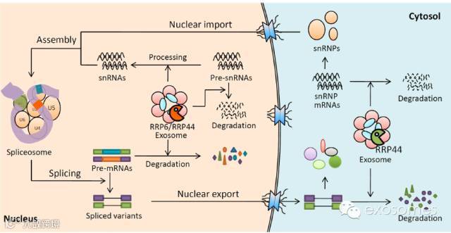 外泌体通过剪接体依赖和非依赖途径来调控未剪接/剪接转录本水平。剪接体依赖途径,外泌体通过影响基因表达、剪接体装配和snRNAs的加工和转换来调节剪接。剪接体非依赖途径,外泌体介导前体mRNAs在核内的降解,这是胞质中剪接和非剪接转录本的转换。