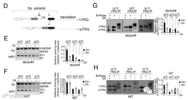 (E,F) 存在或不存在QA时,RT-PCR结果和frq I-6密度定量在dsrrp44 (E) 和 WT (F)损伤生长的剪接。