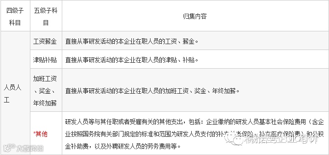 注:五级子科目中,带*的“其他”除根据财税〔2013〕70号规定依照国务院有关主管部门或者省级人民政府规定的范围和标准为在职直接从事研发活动人员缴纳的基本养老保险费、基本医疗保险费、失业保险费、工伤保险费、生育保险费和住房公积金可以纳入研发费用加计扣除范围外,其余项目可作为高新技术企业研发费归集范围,但不得作为加计扣除研发费归集范围。