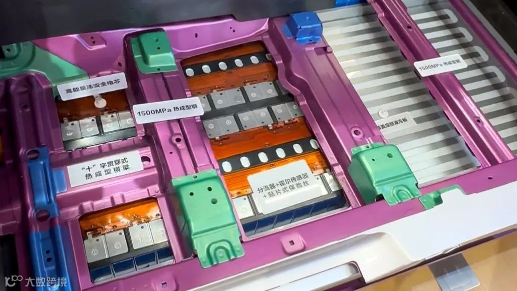在2024年广州国际车展上展出的铂智3X动力电池系统,从中可见目字型动力电池防护框架和1500兆帕超高强度热成型钢材。