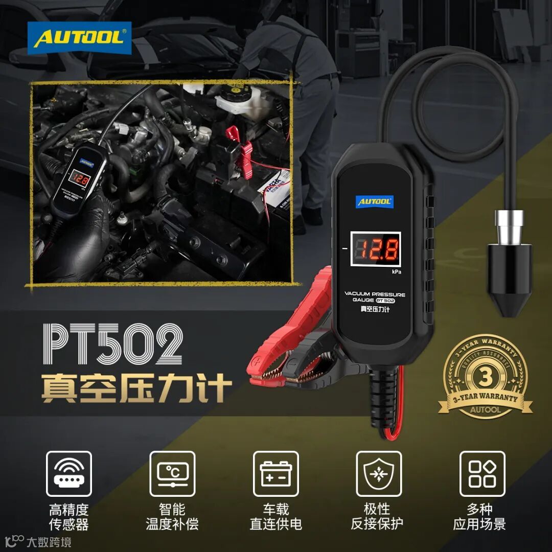 AUTOOL PT502真空压力计具备高精度压力传感器和智能温度补偿功能,可以提供准确可靠的负压测试结果。该产品源于AUTOOL自主研发,不仅拥有多项知识产权,还获得了CE、FCC、ROHS等专业检测机构的权威认证。相比传统机械真空表的指针读数方式,PT502配置数码显示屏,实时显示负压测量值,通过准确的压力数据可快速评估发动机密封性,准确定位漏气点及排气系统堵塞问题,同时有效排查活塞环卡滞、气门密封不良等常见故障,是现代化维修车间的理想检测工具。