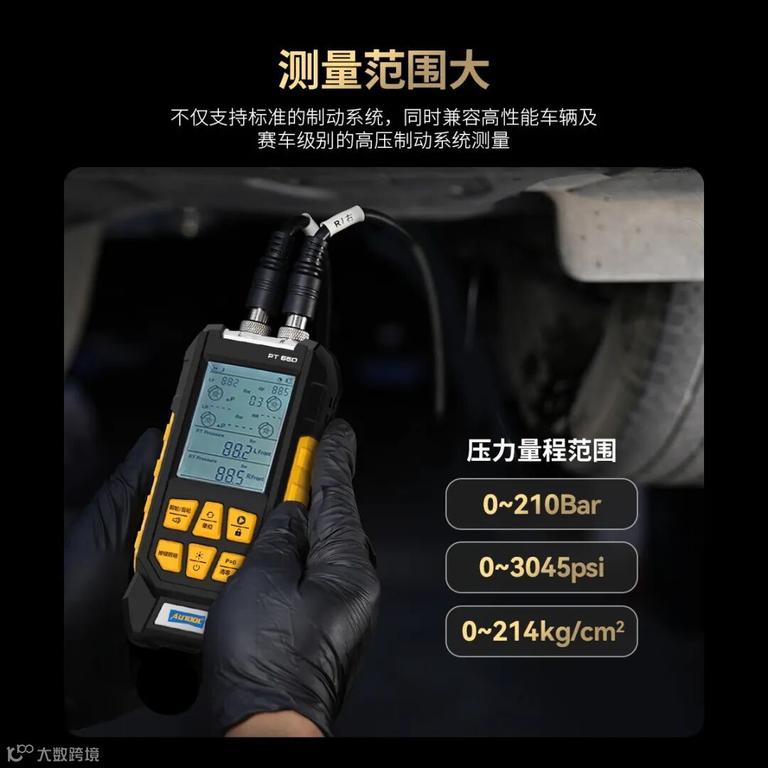 压力测量范围0-210bar,具有广泛的通用性,可检测多种车型,包括普通的家用轿车、SUV、MPV、大型客车、载货汽车以及高性能赛车,都能满足其制动系统压力检测的需求。