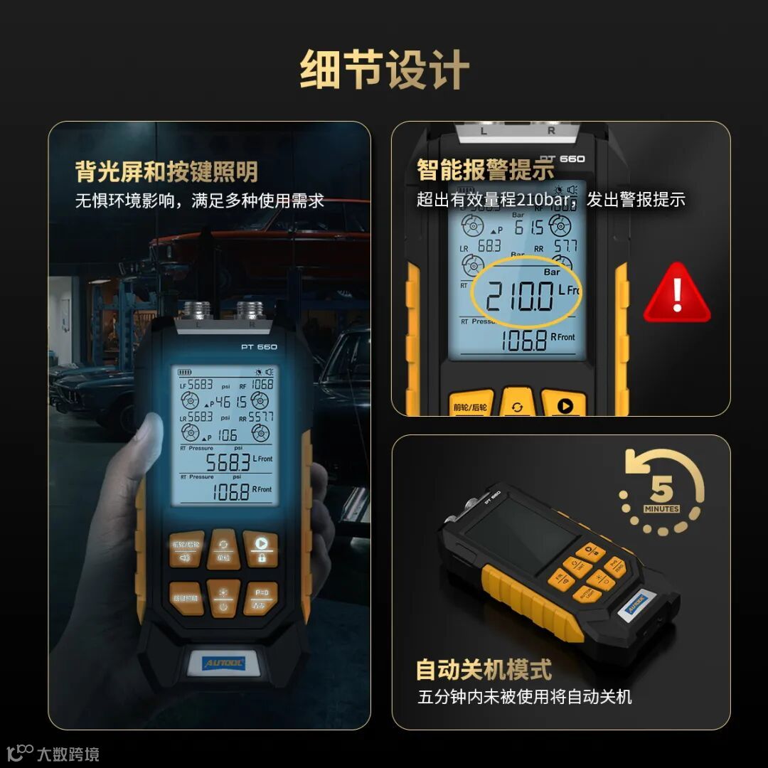 AUTOOL PT660是一款专用于汽车维修领域的智能制动系统压力检测仪,具有多项功能和设计特点,压力测量范围0-210bar,配置多种适配接头,同时可对前后轮制动系统进行压力测量,全面监测制动系统状况,并且拥有大气压校准功能,可根据环境气压状况进行自动校准,无惧强光和昏暗环境,配备3英寸背光显示屏和按键灯,采用先进的压力传感器技术,测量精度可达±1%FS,分辨率可达 0.1bar,可以精准地测量制动系统中的压力变化,帮助维修人员及时发现制动系统的压力异常,确保车辆在行驶过程中稳定安全地运行。