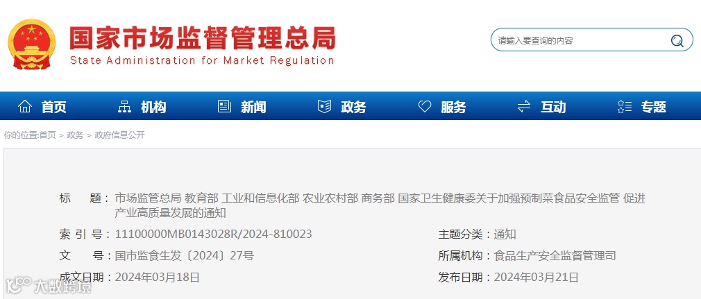 2024年3月,国家市场监督管理总局等六部门联合发布《关于加强预制菜食品安全监管 促进产业高质量发展》的通知,严令禁止预制菜添加防腐剂。