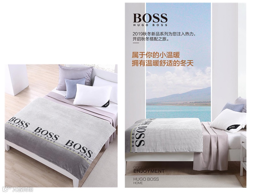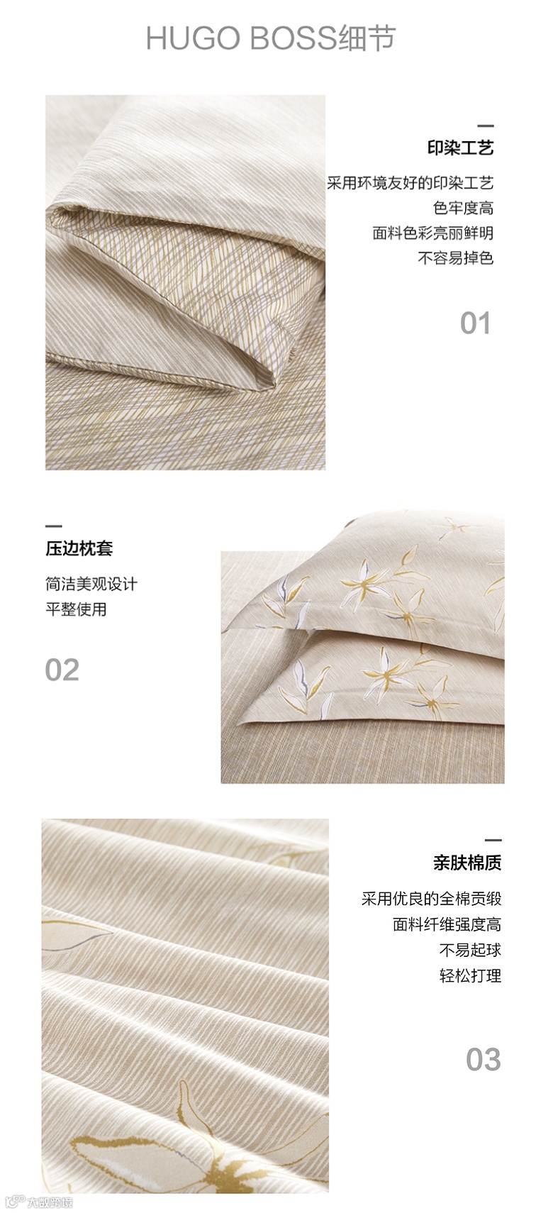 2020年HUGO BOSS主推床品PETALS系列,整体以清新奇异的花卉图案,搭配类似香草冰淇淋的色调,并用显眼的赤褐色描绘其轮廓。画面基底巧妙的使用了秸秆和木纹的浅色条纹,宁静与幸福之感油然而生。