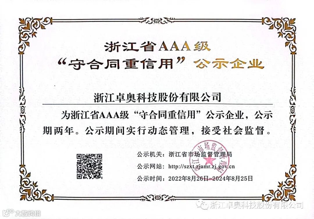 浙江卓奥科技股份有限公司于2022年被认定为浙江省AAA级“守合同重信用”企业。