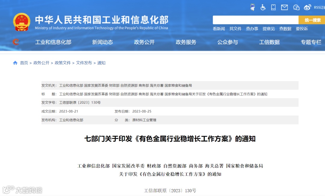 8月21日,工业和信息化部、国家发展改革委、财政部、自然资源部、商务部、海关总署、国家粮食和储备局等七部门联合印发《有色金属行业稳增长工作方案》。《工作方案》提出,有色金属行业涉及品种多、应用广、战略价值突出,是发展战略性新兴产业和国防科技工业的重要支撑,是维护国家资源安全和产业安全的重要领域。为深入贯彻党的二十大和中央经济工作会议精神,把稳增长摆在首要位置,推动有色金属行业质的有效提升和量的合理增长,实现发展预期目标,特制定本方案,实施期限为2023—2024年。