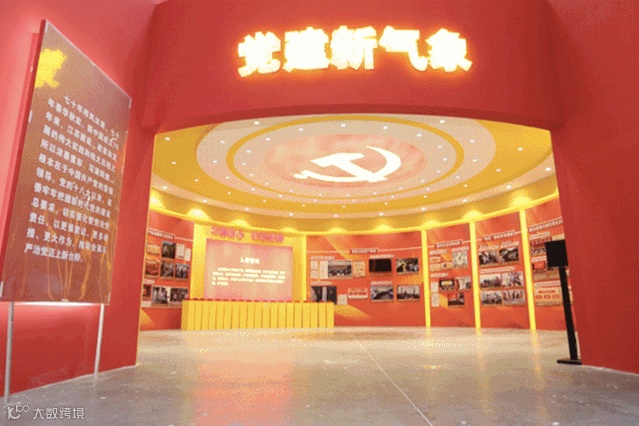 尾厅部分设置了党建新气象专题展区,以及点赞英模、“我和我的祖国”快闪国旗墙、祝福祖国、我对祖国说4个互动展台和结语。