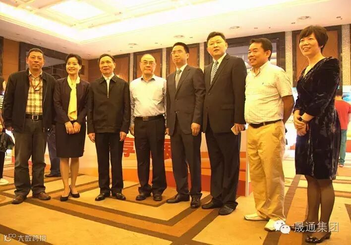 晟通集团高层领导与中国工程院院士黄伯云、刘经南,以及省市区相关领导在集团展台前合影留念。