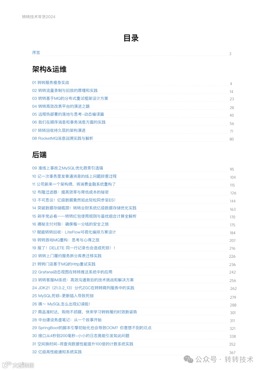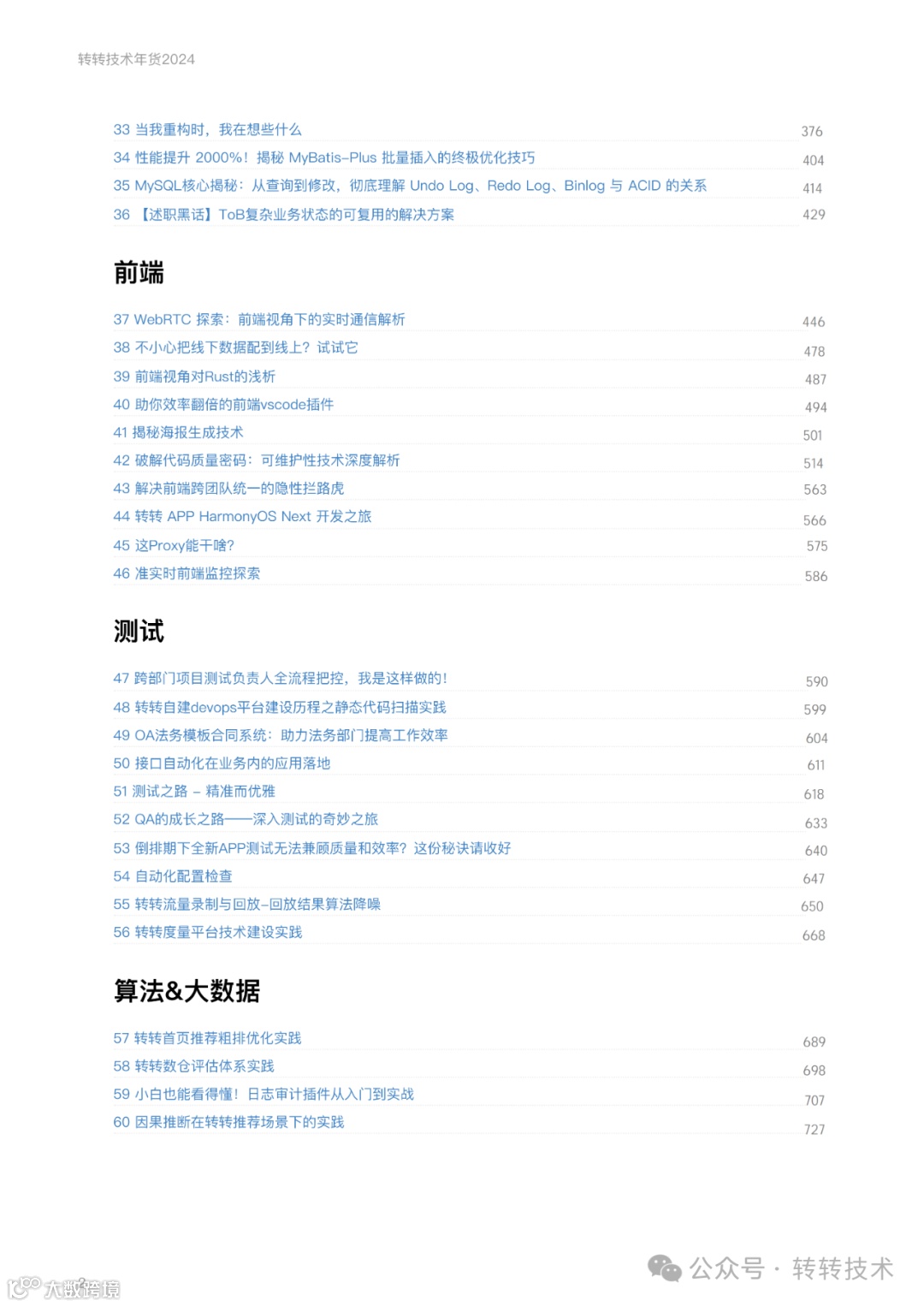 在过去的这⼀年⾥,转转研发中⼼三个公众号《转转技术》、《⼤转转FE》和《转转QA》共计发表百余篇技术⽂章,涉及各个部⻔的⼀线实践经验。在2025年春节来临之际,我们精选了其中60篇,整理制作成⼀本厚达700多⻚的电⼦书,作为新年礼物赠送给⼤家。这本电⼦书,是转转技术团队智慧与汗⽔的结晶,它记录了我们在架构运维、后端、前端、测试、算法、数据等领域的探索与突破,展现了转转如何利⽤前沿技术优化⽤户体验,提升服务质量,推动⾏业发展的决⼼与实⼒。它不仅是⼀份技术的回顾,更是⼀次对未来的展望。它也记录了转转在技术创新道路上的每⼀步脚印,也预示着我们在未来将继续以⽤户为中⼼,以技术为驱动,不断探索,不断突破,为⽤户带来更加智能、更加便捷、更加美好的服务体验。