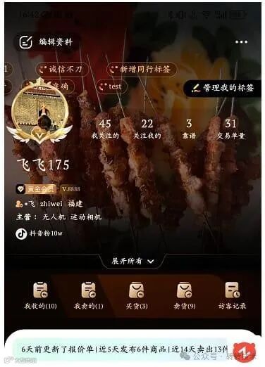 1.个人主页会有我关注的数量,关注我的数量,靠谱数量,交易数量,以及一系列的按时间段统计的跑马灯数据。多数用户维度相关的数据都是在个人中心的上半部分进行展示,而下半部分,则是对这个用户内容维度,交易维度统计的一个汇总。同时,统计的数据,既有实时维度,也会有时间段维度,例如,我们会统计用户的总的交易单量,也会统计这个用户最近N天的交易数量。