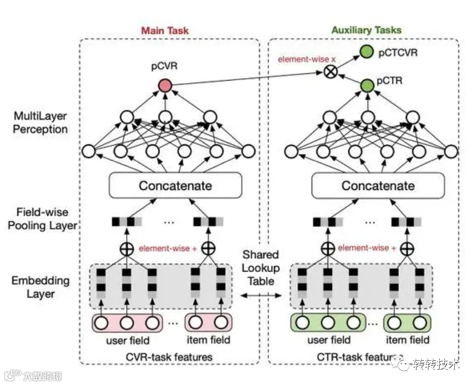多任务的另外一条支线是以阿里的 ESMM[4] 算法为代表的,适用于存在条件关系的多个目标之间的学习算法,比如电商场景经典的点击率和转化率的多目标学习,该算法同时解决了训练和线上推理阶段样本空间不一致的问题,论文提及在实践应用中取得了可观的准确率提升。