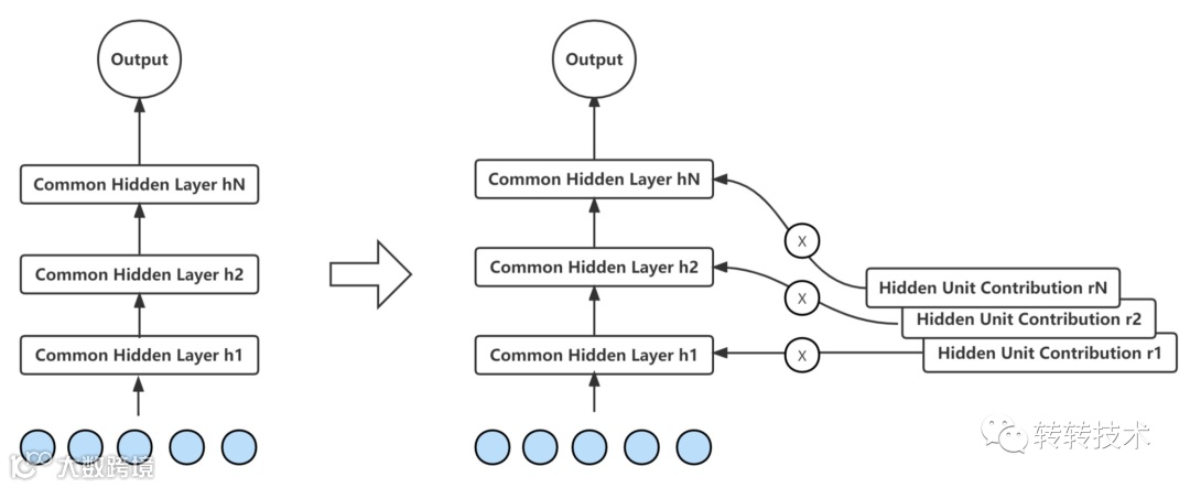 LHUC(Learning Hidden Unit Contributions)[5] 是最初应用在语音识别领域,后又迁移到搜推等算法场景的模型。以推荐系统为例,精排阶段的模型多采用深度神经网络,根据输入特征,通过隐向量表达个性化,然而在多场景的情况下,尤其是当特征工程刻画不够丰富时,不同场景的不同用户,有可能出现相同/相似的向量表示,从而导致模型的输出相同/相近,带来一定程度的模型坍塌。借鉴语音识别领域,为每个 speaker 单独调整 dense 参数可以带来效果上的提升,推荐系统可以为不同场景和用户构建个性化网络,并以动态权重的形式作用于模型,从而提升模型的表达能力。