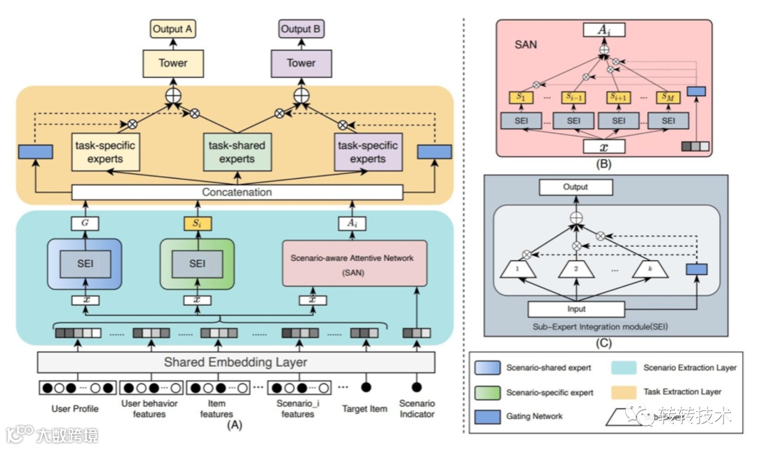场景抽取模块,用于获取场景的表征,具体又包括了场景共享专家网络,场景独有专家网络,以及场景敏感的注意力网络(SAN),分别刻画场景共享信息,场景独有信息,以及场景间的关联信息;