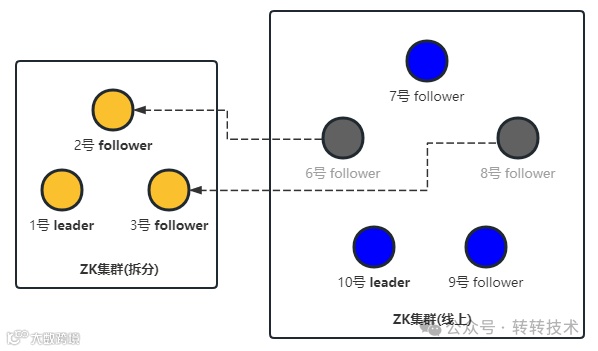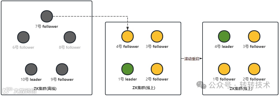 老ZK集群节点6号/7号/8号/9号/10号都必须在实例本机ZooKeeper-3.4.13版本新工作路径操作节点替换,业务客户端缓存的ZK节点DNS解析IP地址不能变。