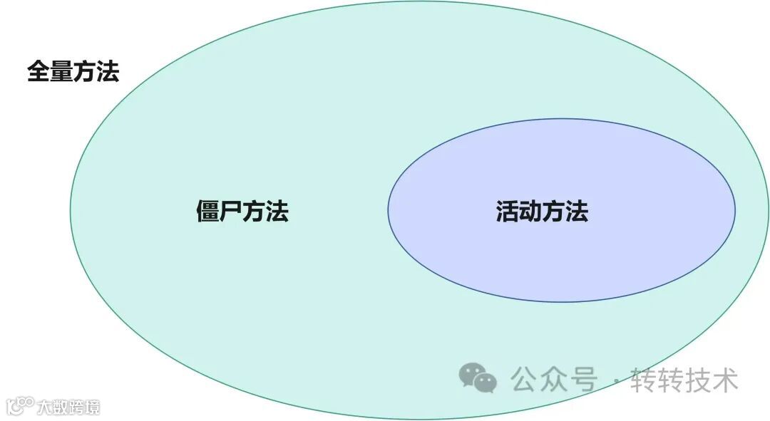 僵尸方法就是指长期没有调用的方法,如果想获取僵尸方法的集合,只需要取项目全量方法和活动方法(有调用的方法)的差集,如下图所示。