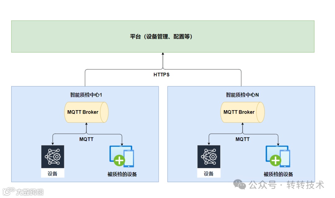 在智能质检中心内部署,设备通过局域网连接到 Broker,处理当前质检中心设备的消息传递。