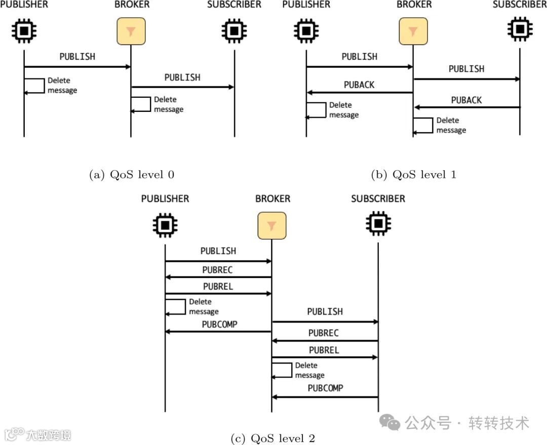 QoS 2 能够确保消息仅传递一次,是最可靠的消息质量等级。尽管在网络延迟上有所牺牲,但 PUBREC、PUBREL 和 PUBCOMP 报文大小仅为 4 个字节,使得延时在大多数情况下可以接受。选择 QoS 2 可以让开发人员更专注于应用逻辑,而无需过多担心消息传输的可靠性问题。