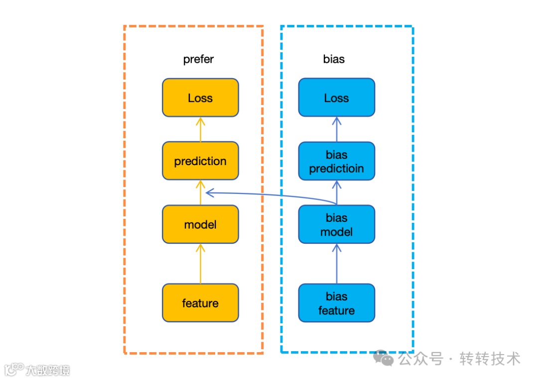 输入特征不是独立的,prefer部分包含着bias侧的特征,训练时loss公式为 , 中 = ,这里 以及 中的 是一个超参数,网格搜索后取0.1和30。