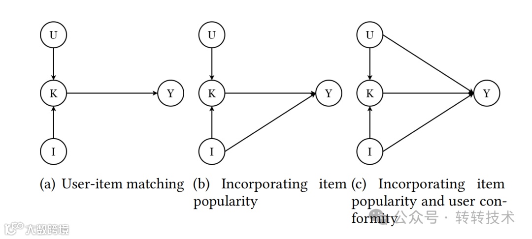 作者认为用户对某个物料的评分取决于三个方面,用户-物料匹配度(user-item matching)、物料流行度(item popularity)和用户从众度(user conformity)。现有的推荐模型主要关注用户-物料匹配度(图a),忽略了物料的流行度是如何影响交互概率的,假设两个物料对于一个用户有相同的匹配度,流行度较高的物料收集到反馈的更多,更有可能被用户所知(图b)。除此之外,有些用户更愿意跟随潮流,什么火就看什么,有些用户则不会,加入 这条边能反应用户的流行敏感度偏差造成的估计偏差(图c)。