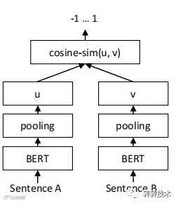 Bert计算两个句子相似度时,把两个句子同时输入Bert,进行信息交互,计算速度是比较慢的,无法事先计算好句向量,语义搜索时比较慢。Sentence-Bert借鉴了孪生网络的框架,将两个句子送入两个Bert模型中,这两个模型的参数是共享的,网络结构[4]如下图所示。Bert网络输出每个token的embedding向量,通过pooling策略生成句向量的表征。论文中分别用"[CLS]"位,平均池化,最大池化生成句向量的表征,实验表明pooling策略采用平均方式效果最好。得到的句向量计算两者的余弦相似性,用来衡量这两个句子的相似度。