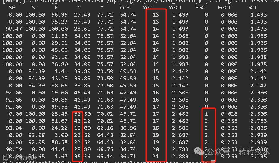 根据以上的结论,我们再来看一下GC的情况,执行命令:jstat -gcutil 6556 1000 100