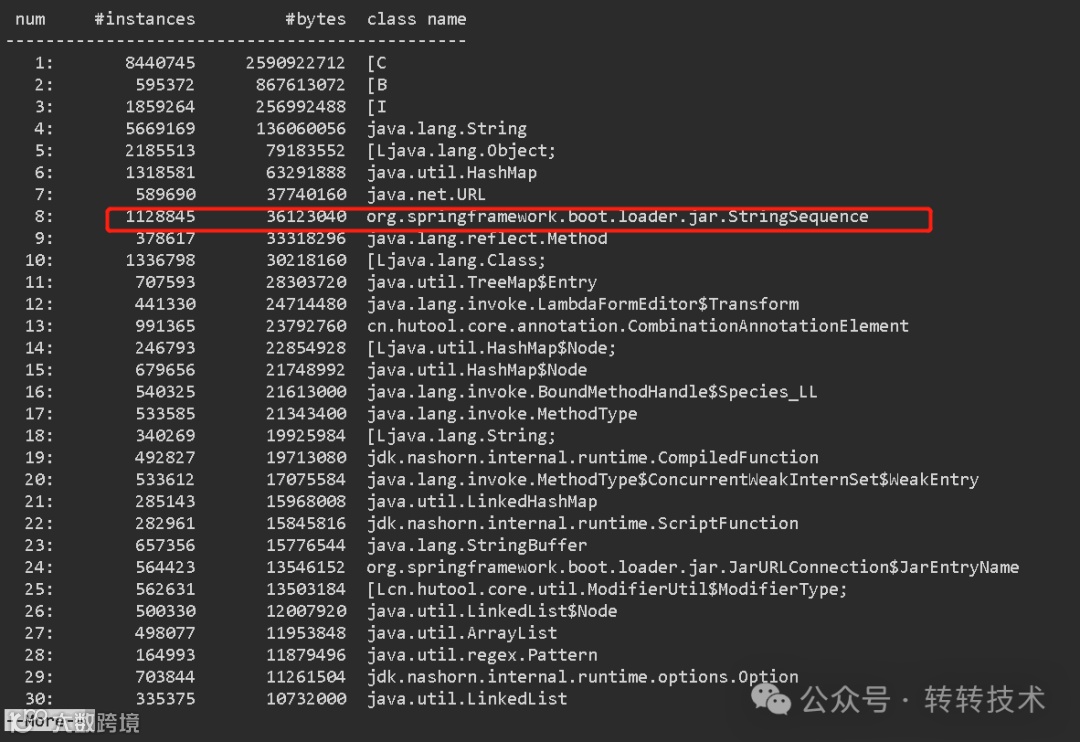 果然,这个StringSequence是springboot内置的东西。这种不是常用的类,居然有这么多实例,就非常值得怀疑,可以重点排查。