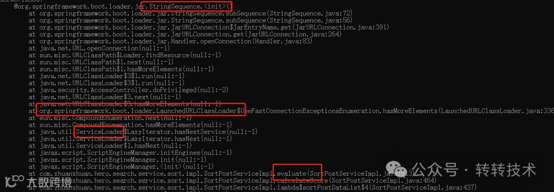 SpringBoot为了将业务jar包封装在其fatJar里,替换系统类加载器为LaunchedURLClassLoader,而LaunchedURLClassLoader加载资源过程会遍历所有的业务jar包,并且每一个jar包的遍历过程中,会实例化一个StringSequence。这个也就解释了StringSequence内容为啥都是类似 "file:/C:/Users/Administrator/IdeaProjects/hero_search/service/target/hero_search.jar!/BOOT-INF/lib/transport-netty4-client-7.6.2.jar!/META-INF/services/javax.script.ScriptEngineFactory" 的字符串。因为需要遍历每个jar包尝试获取匹配的资源。