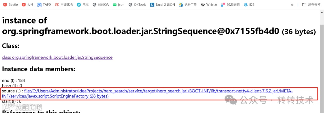就是这里了,实例有个字段叫source,然后这个字段值是"file:/C:/Users/Administrator/IdeaProjects/hero_search/service/target/hero_search.jar!/BOOT-INF/lib/transport-netty4-client-7.6.2.jar!/META-INF/services/javax.script.ScriptEngineFactory "。