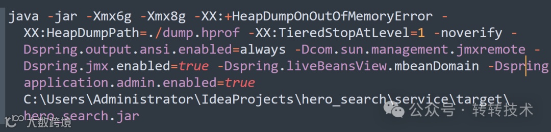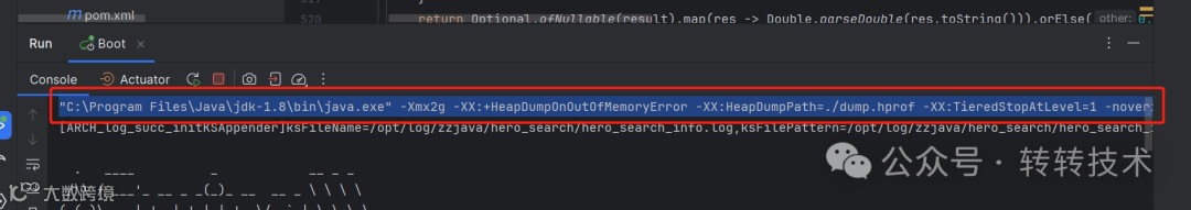 …… 不对,有问题。刚才都说了,SpringBoot是用单一的fatjar包去启动的,那会不会是IDEA测试和服务器上的项目启动方式有区别呢?我们可以看一下idea的启动相关信息。拷贝idea控制台启动信息第一行就是了。