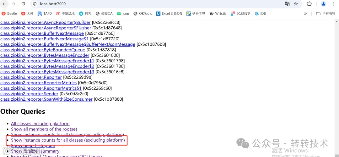 执行命令:jhat -J-Xmx4g dump.hprof ,加载堆转储文件。它将分析文件并启动一个 HTTP 服务器,允许你通过浏览器访问分析结果。