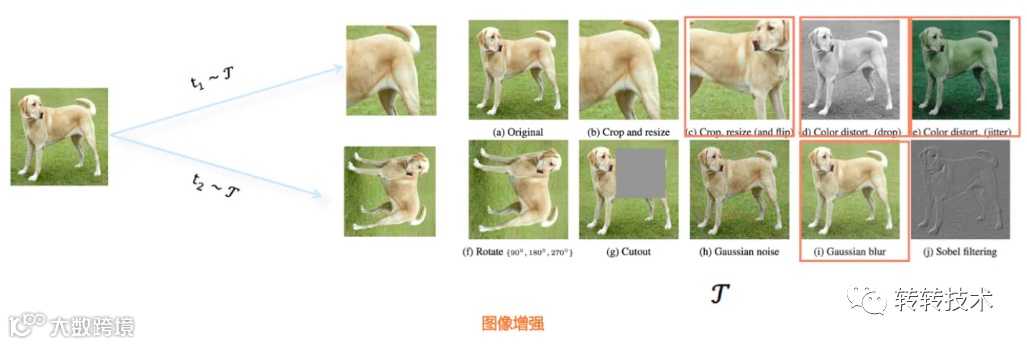 对比学习的标签信息来源于数据本身,核心模块是数据增强。图像领域的数据增强技术是比较直观的,比如图像的旋转、遮挡、取部分、着色、模糊等操作,都可以得到一张与原图整体相似但局部相异的新图(即增强出来的新图),下图是部分图像数据增强的手段(出自SimCLR[1])。