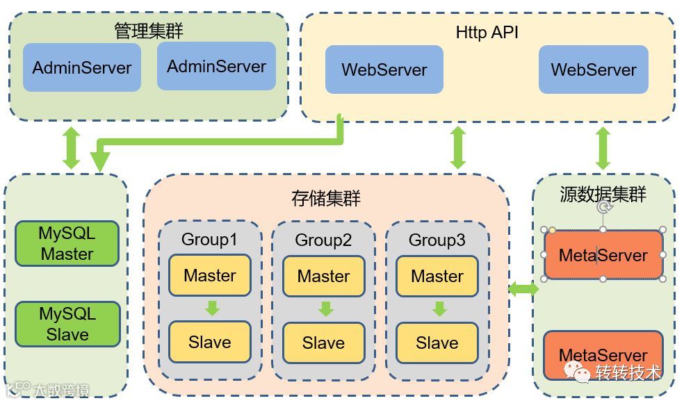 存储集群:负责存储二进制数据,集群以Group为单位,每个Group由两个存储节点组成(一主一从)。