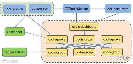 分布式Redis服务的解决方案,兼容Redis协议,底层使用分布式存储方案。ZZRedis基于开源项目Codis做的二次开发,实际上转转早期我们是直接使用的Codis,稳定性和性能表现都很好。那么我们为什么还要做二次开发呢?首先我们先来看下Codis的架构: