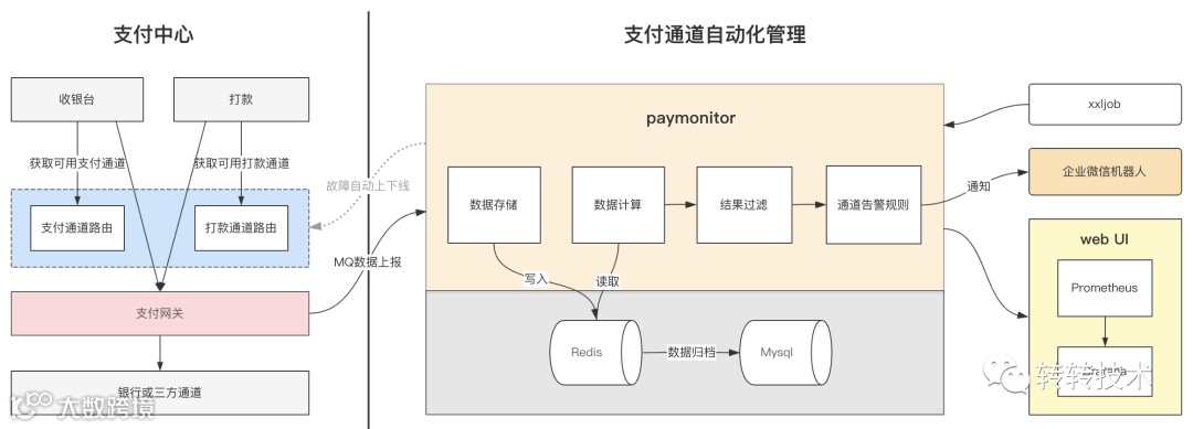监控系统在监听到消息后,将监控的数据存储到 Redis,再由数据计算模块拉取 Redis 的数据进行筛选过滤后,汇总计算各通道的失败率,最后根据各通道配置的告警规则触发通道异常告警。