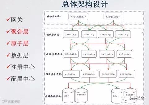 那么典型的微服务架构由哪些元素组成的?如下图,包括网关、微服务业务逻辑层(聚合层)、数据访问层(原子层)、数据存储、注册中心、配置中心。网关负责请求接入,聚合层用于各种业务逻辑的处理,数据原子层用做数据访问代理,提供ORM、数据Sharding以及屏蔽底层存储的差异性等功能。