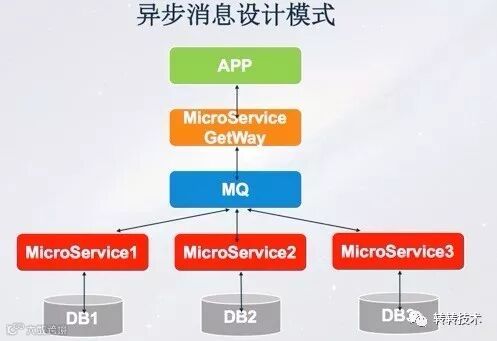 第四异步消息设计模式,上述三种架构模式本质都是同步模式。一个APP请求必须等到每个环节都处理完才会得到应答。如果APP请求不需要关注处理结果,可以使用异步来实施。一个APP更新请求经过微服务网关后,请求持久化到消息队列,写入消息队列成功后马上给APP端回应。之后微服务再从消息队列异步消费,从而提高系统整体吞吐量。这类架构对社区等大流量的业务场景适用,但对金融、交易等对数据敏感性高的场景不适用。