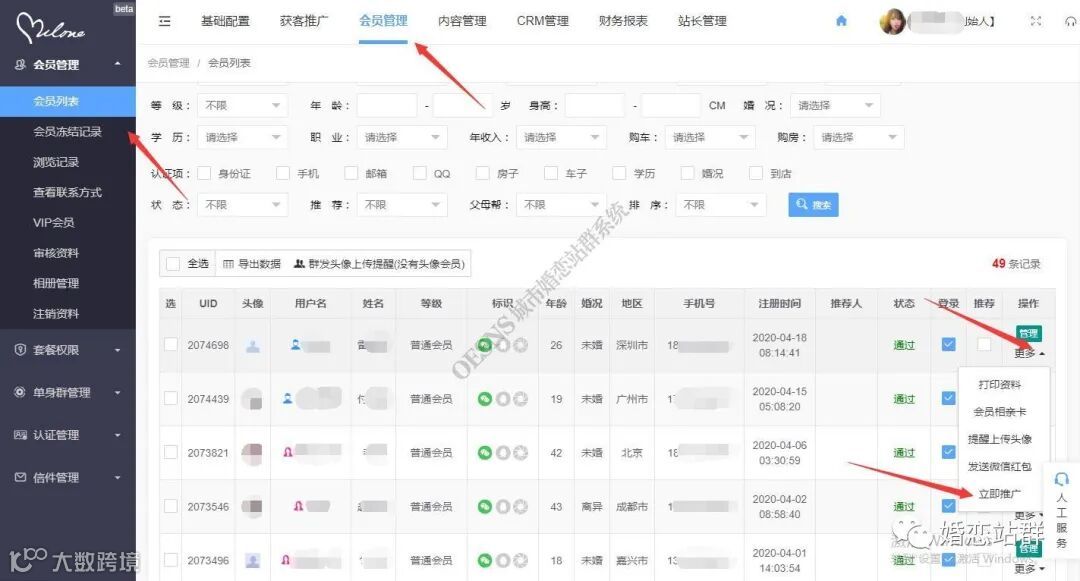 1、直接在后台的会员列表点击推广,即可将对应的会员资料转化成嘉宾/文章进行分享引流。