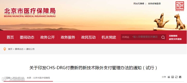 2023年7月13号北京市医疗保障局发布了《关于印发CHS-DRG付费新药新技术除外支付管理办法的通知(试行)》(以下简称《通知》),《通知》提出CHS-DRG付费将满足条件的创新药品、医疗器械等进行除外支付。