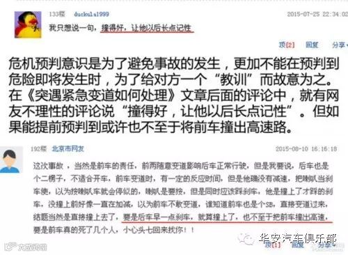 “危机预判意识”是为了在预判到接下来即将发生什么危险时做出应对措施,避免事故的发生;并非是在预判到前车出现违规危险行为时,为了给所谓的对方一个“教训”而任由危险的发生。在《突遇紧急变道如何处理》文章后面的评论中,就有网友不理性的评论说“撞得好,让他以后长点记性”。但也正如理性的网友所评论的“要是后车早一点刹车,就算撞上了,也不至于把前车撞出高速,要是前车真的死了几个人……”这样你还会觉得安心吗?