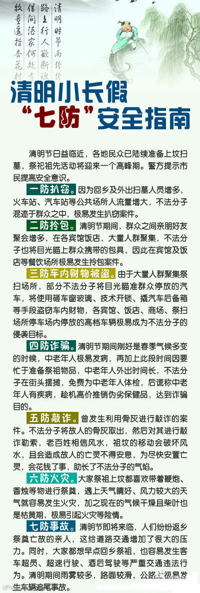 清明渐近,上坟扫墓、春游渐入高峰。警方提示需关注:一防扒窃、二防拎包、三防车内财物被盗、四防诈骗、五防敲诈、六防火灾、七防事故。
