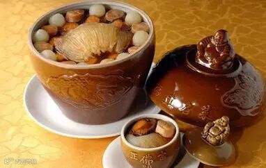 佛跳墙,又名 " 满坛香 "、" 福寿全 ",是福州的首席名菜,原料有 18 种之多:海参、鲍鱼、鱼翅、干贝、鱼唇、花胶、蛏子、火腿、猪肚、羊肘、蹄尖、蹄筋、鸡脯、鸭脯、鸡肫、鸭肫、冬菇、冬笋等,具有补气养血、清肺润肠、防治虚寒等功效。