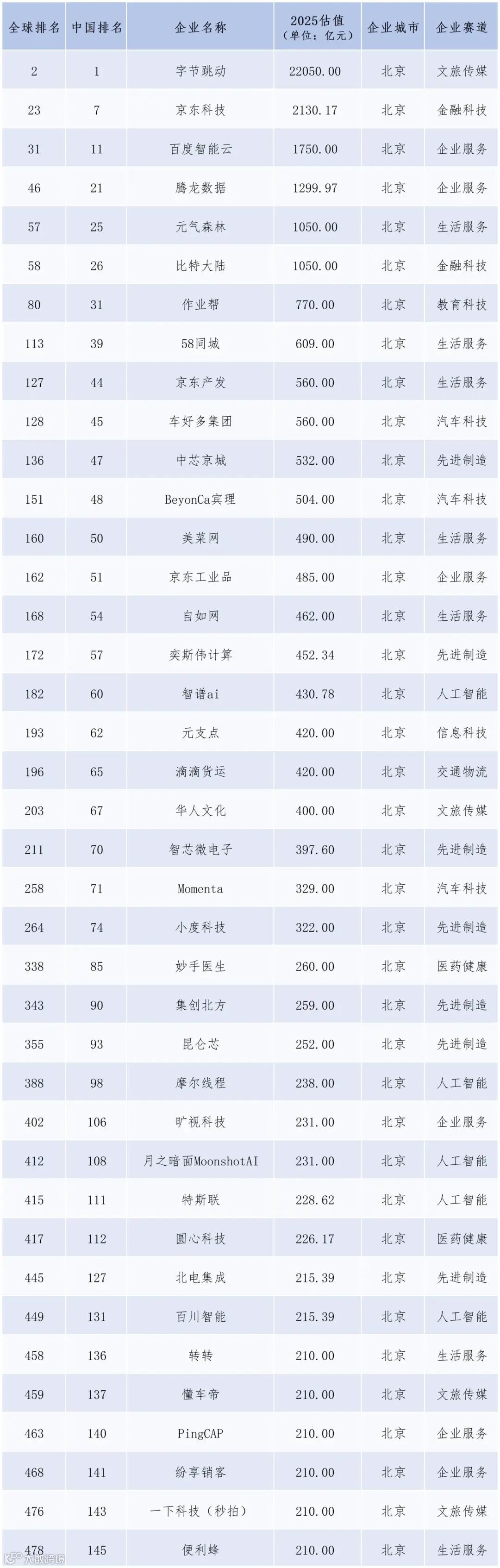 统计数据显示,2025年全球独角兽企业500强总估值达39.14万亿元,同比增长超30%;平均估值从598.83亿元升至782.76亿元,同比增长30.71%。